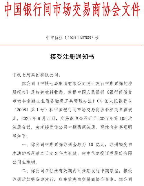 【大河财立方消息】10月10日消息配资在线机构论坛网,中国银行间市场交易商协会日前批复,接受中铁七局集团有限公司中期票据注册,注册金额10亿元,注册额度自9月11日起2年内有效,由中信建投证券主承销。